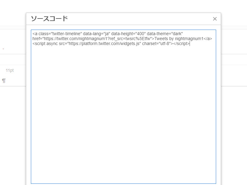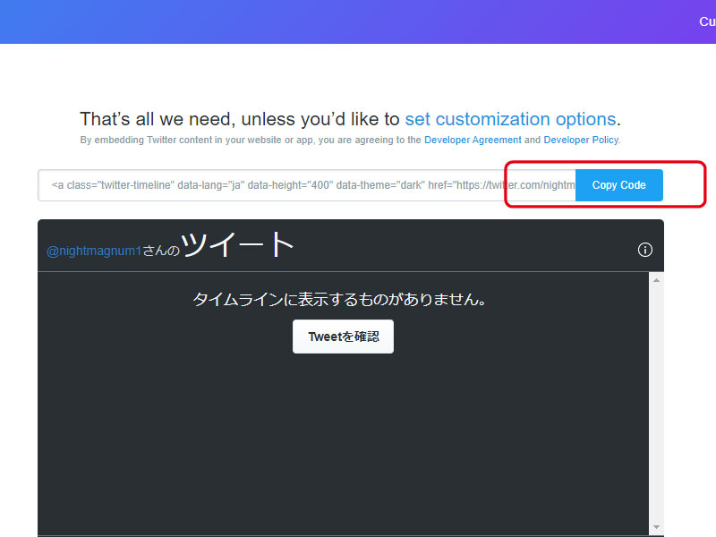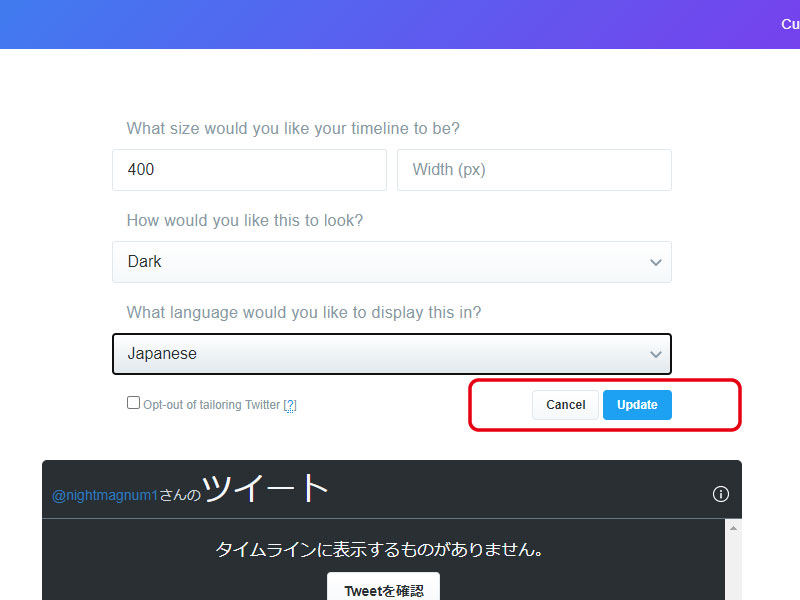 "Enter a Twitter URL"에 타임라인을 표시할 트위터 프로필 URL(https://twitter.com/~사용자명~)을 입력해 주세요.